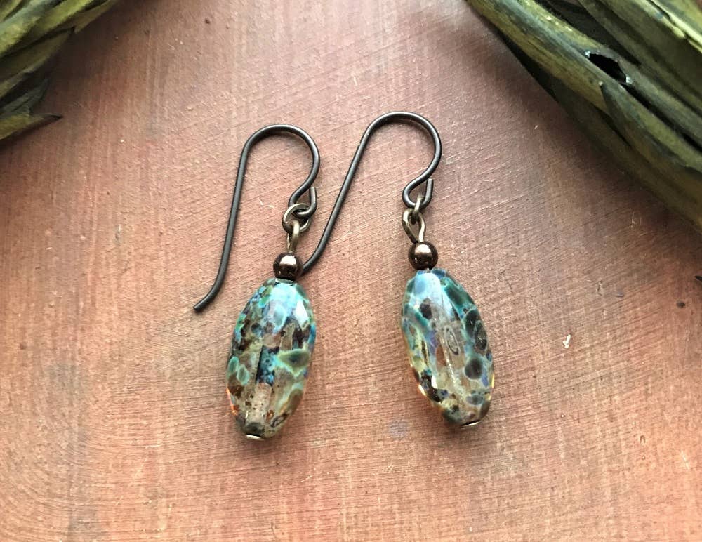 These earthy yet elegant earrings feature Czech glass elongated ovals that are speckled with Picasso edging and accented with bronze glass rounds. The ear wires are hypoallergenic niobium. Approximately 1-1/4 inches long (below ear wires).