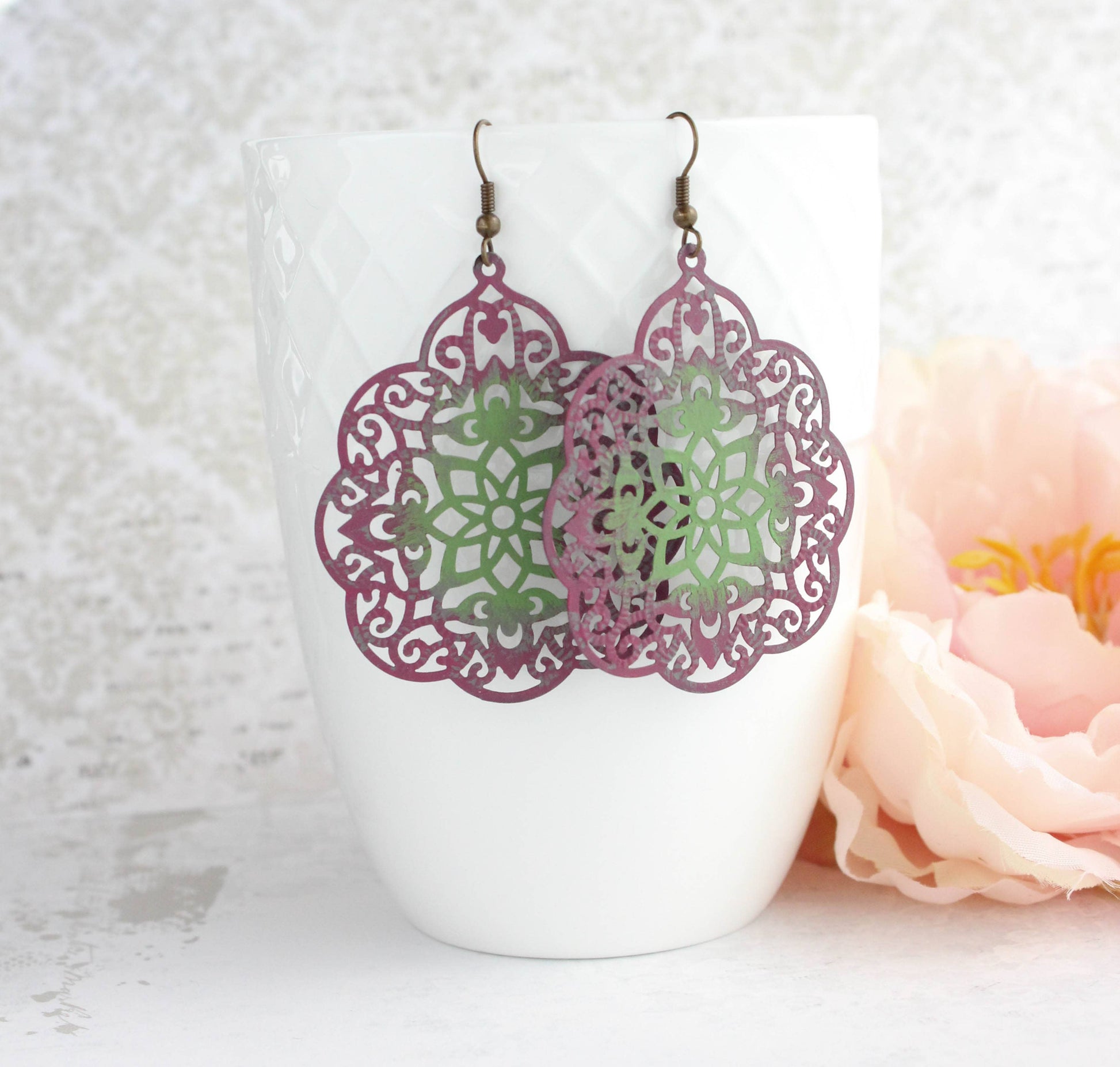 These two tone berry merlot purple and green finish patina earrings are lacy and lightweight! Morrocan style detailed filigree earrings that have hand-painted blue patina. These beautiful filigree doilies are antique brass metal and are painted on only on one side. Because each filigree earring piece is painted by hand, there can be slight variations in the distressed paint effect. These have wonderful details and are a fun accessory for any day!!